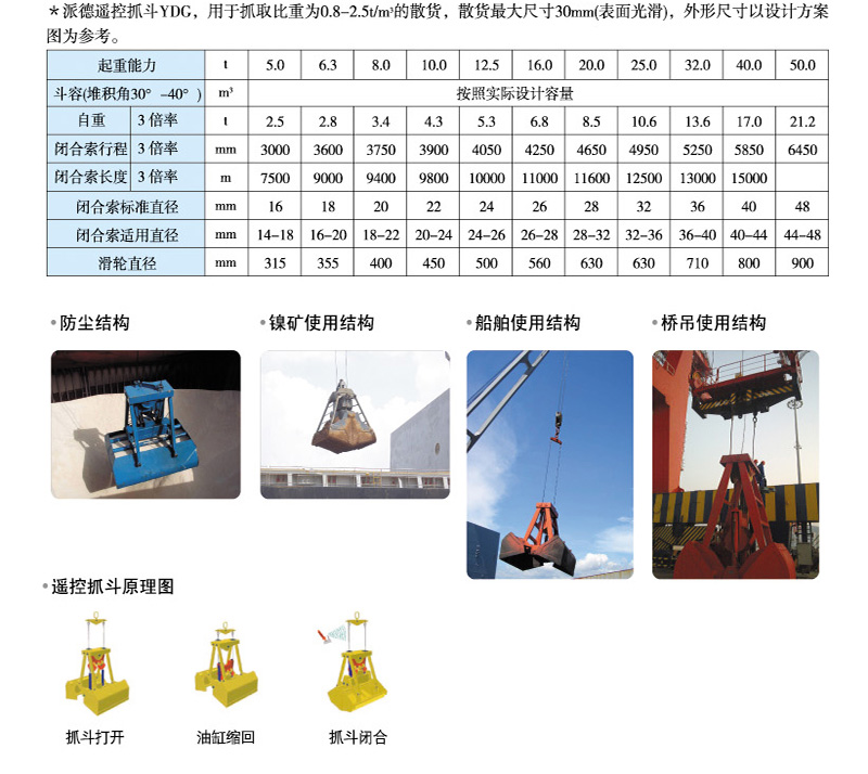 遙控抓斗是一種配合單索起重機(jī)通過無線遙控發(fā)射器來控制打開的新穎抓斗。它不需要外界能源,在料堆上能隨吊鉤的起升自動(dòng)閉合,又能在空中任意位置自動(dòng)打開并可以隨時(shí)停止。抓斗內(nèi)部有蓄電瓶,通過控制電磁閥的開閉來控制抓斗的打開。抓斗不需要其它任何電源,綠色環(huán)保。該抓斗作為一種機(jī)電一體化的新發(fā)明而深受用戶的歡迎。它的誕生改寫了起重運(yùn)輸行業(yè)中單索抓斗效率低下的歷史。遙控抓斗一般由上承梁總成、滑移座總成、下承梁總成、斗體、撐桿以及油缸幾大部件組成。其中上承梁總成和滑移座總成中有與起重機(jī)相連的滑輪組,油缸的筒體及活塞桿分別與下承梁總成及滑移座總成聯(lián)接。滑移座可以在起重機(jī)作用下上下滑動(dòng),帶動(dòng)下承梁一起起升,從而帶動(dòng)抓斗閉合;通過遙控器控制下承梁和滑移座的脫開,從而控制抓斗的打開。